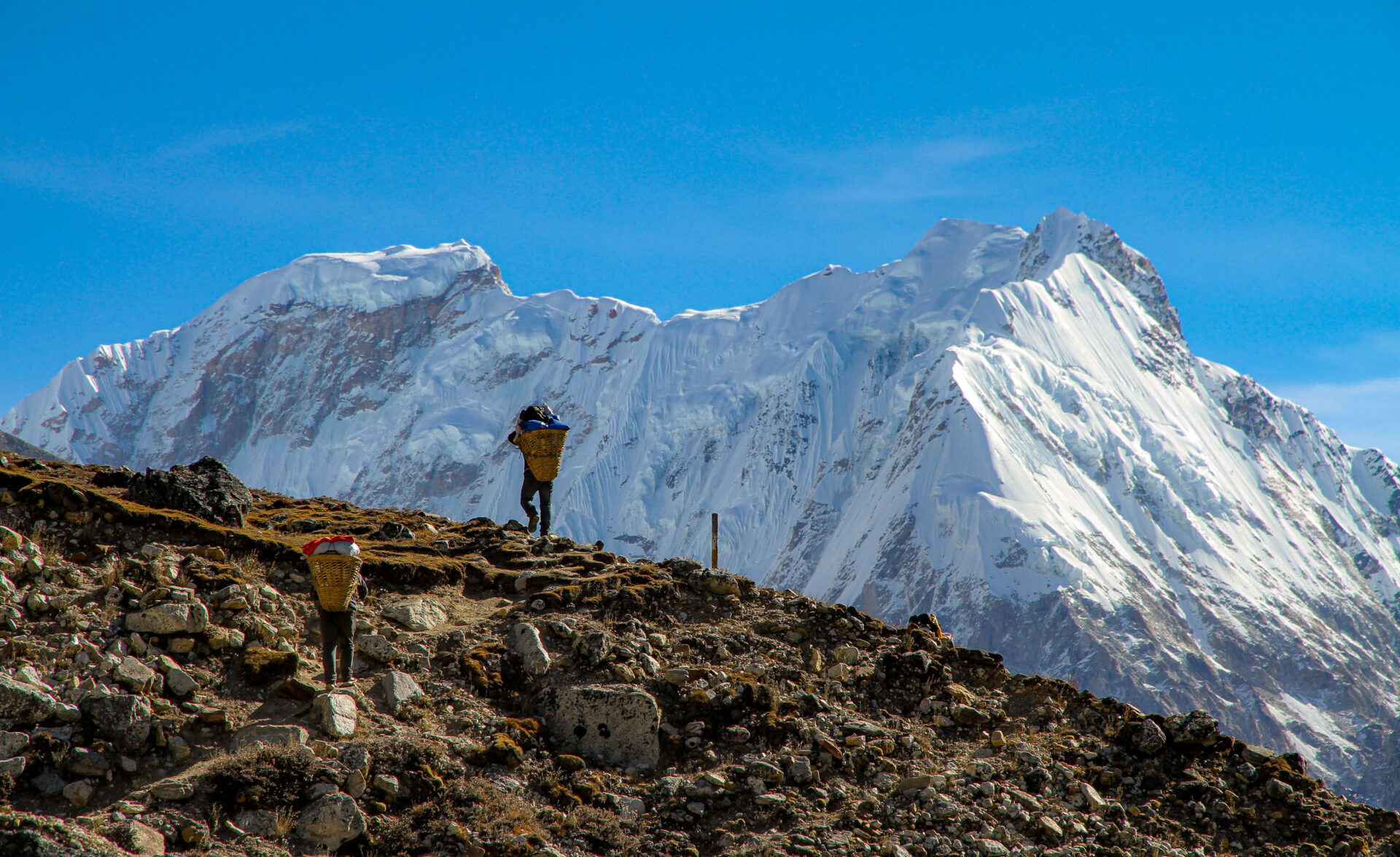 En trek, vous ne portez que votre sac de jour. Notre équipe de porteurs se charge de porter l’équipement commun de cuisine et de campement ainsi que votre bagage. Nous demandons à nos voyageurs de s’en tenir au matériel suggéré sur la liste d’équipement du voyage (fournie à l’inscription) afin de ne pas surcharger notre équipe. Chaque voyageur est limité à 15kg de bagages. Il est possible de laisser des choses à Katmandou que l’on récupère à la fin du trek.